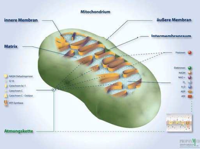 Da Mitochondrien, im Gegensatz zur DNA des Zellkerns, nur ein ineffizientes Reparatursystem besitzen, wirken sich hier Schädigungen durch freie Radikale besonders katastrophal aus. Defekte im mitochondrialen Genom (Genom= Gesamtheit des Erbmaterials) haben vor allem Auswirkungen auf die Energieversorgung der Zelle.